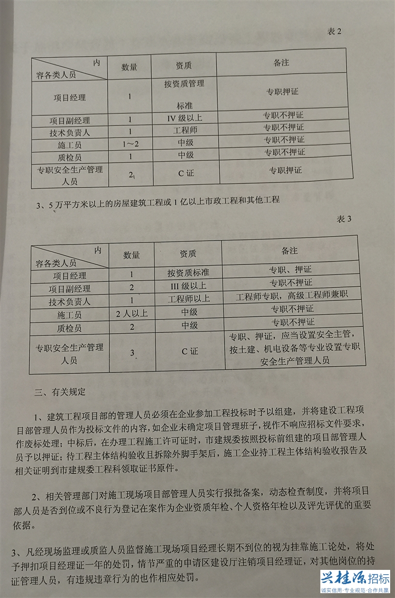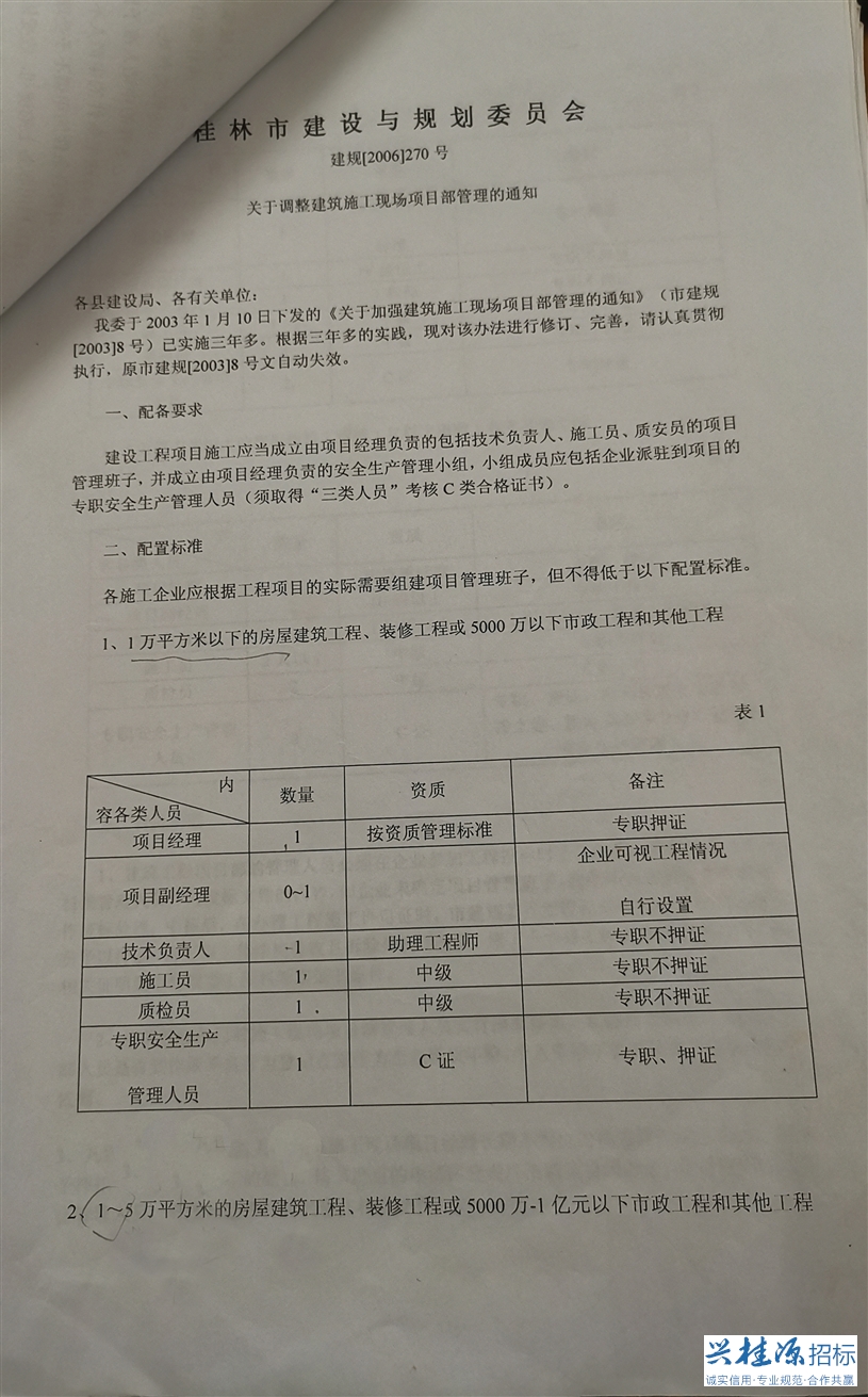 3、桂林建設(shè)與規(guī)劃委員會(huì)建規(guī)【2006】270號(hào)《關(guān)于調(diào)整建筑施工現(xiàn)場(chǎng)項(xiàng)目部管理的通知》詳見公告附件1。